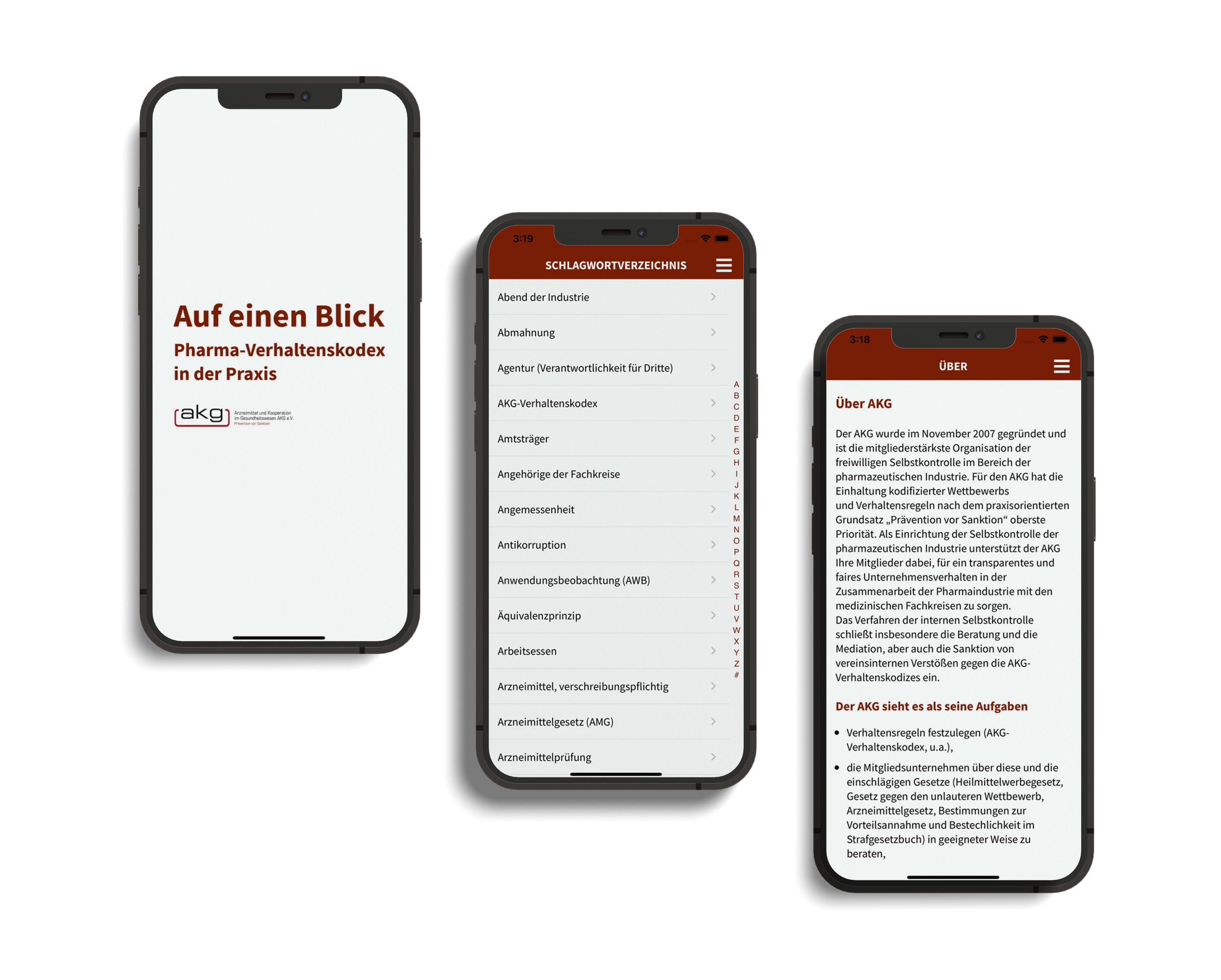 Die AKG Arzneimittel und Kooperation im Gesundheitswesen e. V. wünschte sich eine digitale Form für den Pharma-Verhaltenskodex, sodass dieser jederzeit griffbereit ist und ggfs. in der täglichen Praxis den Unternehmensjuristen ersetzt. Der Zugang zur App ist Fachkreisangehörigen vorbehalten.